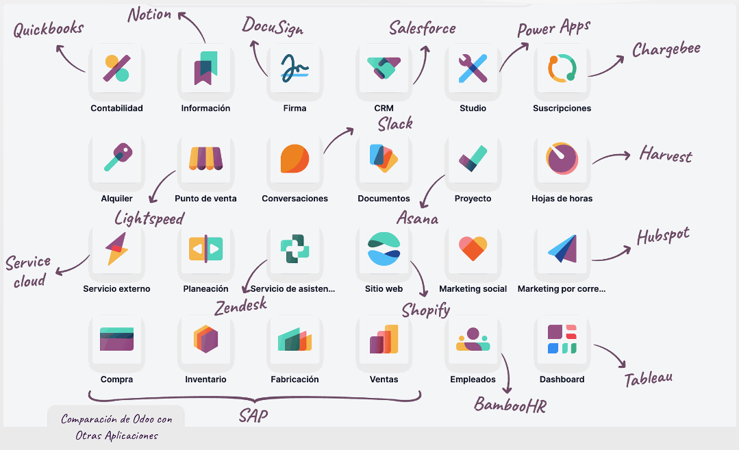 ¡Con ERP Odoo, puedes reemplazar todas estas aplicaciones!
